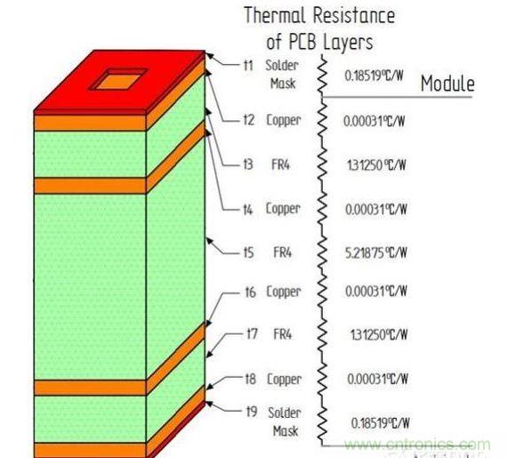 請注意,這些值只是一個通孔本身的熱阻,并未考慮穿過電路板的每一段與圍繞它的材料是橫向連接的。