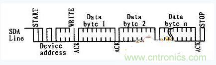 如果主設(shè)備要向EEPROM中寫數(shù)據(jù),在地址字節(jié)中主設(shè)備向EEPROM發(fā)出一個(gè)寫請(qǐng)求(R/W=0),發(fā)送的地址字節(jié)之后緊跟著要發(fā)送的數(shù)據(jù)。每發(fā)送一個(gè)字節(jié)的數(shù)據(jù)后EEPROM就會(huì)產(chǎn)生一個(gè)應(yīng)答信號(hào),主設(shè)備也會(huì)監(jiān)控應(yīng)答信號(hào),如果在發(fā)送一個(gè)字節(jié)后EEPROM沒有返回應(yīng)答信號(hào),則主設(shè)備就會(huì)停止發(fā)送,并生成一個(gè)結(jié)束信號(hào)。寫操作的時(shí)序如圖3所示。