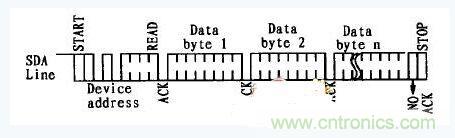 要從EEPROM中讀取數(shù)據(jù)時(shí),應(yīng)設(shè)置R/W=1.在EEPROM發(fā)送完一個(gè)字節(jié)的數(shù)據(jù)后,主設(shè)備產(chǎn)生一個(gè)應(yīng)答信號(hào)來響應(yīng),告知EEPROM主設(shè)備要求更多的數(shù)據(jù),對(duì)應(yīng)主設(shè)備產(chǎn)生的每個(gè)應(yīng)答信號(hào)EEPROM將發(fā)送一個(gè)字節(jié)的數(shù)據(jù)。當(dāng)主設(shè)備不發(fā)送應(yīng)答信號(hào)并隨后發(fā)送結(jié)束信號(hào)位時(shí)結(jié)束此操作。讀操作的時(shí)序如圖4所示。