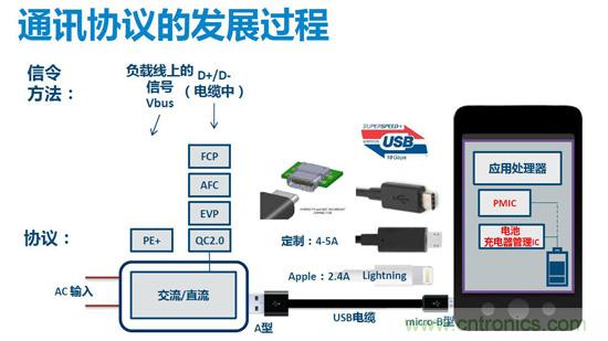 從事電源設(shè)計(jì)開(kāi)發(fā)和技術(shù)支持工作超過(guò)24年的Jason分析道,從線型降壓電源開(kāi)始,電源開(kāi)發(fā)在摸索中前進(jìn),體積越做越小,充電方式也迎來(lái)了新的變革,現(xiàn)在的趨勢(shì)是快速充電。以前的充電器只提供一個(gè)固定的輸出電壓(5V),電源提供的輸出功率取決于輸出電流的大小,輸出電流越大則提供給電池端的功率更大,從而提高充電效率減小充電時(shí)間。但電流不能無(wú)限制的增加,因在輸出電纜的功耗隨電流的增大會(huì)相應(yīng)的增加。因而快速充電應(yīng)用應(yīng)運(yùn)而生。其實(shí)現(xiàn)方法是手機(jī)跟充電器進(jìn)行雙向通訊,電源會(huì)根據(jù)負(fù)載端發(fā)出的指令做出反應(yīng),改變其輸出電壓和電流,實(shí)現(xiàn)減小功率損耗、增大充電功率、減小充電時(shí)間的目的,從而實(shí)現(xiàn)快速充電。