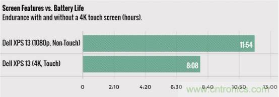 拋開電池技術(shù)本身止步不前的原因,筆記本電腦電池壽命沒有進(jìn)步的主要原因在于其他硬件發(fā)展。雖然處理器每一年都在功耗方面擁有一定進(jìn)步,但4K屏幕、觸摸屏、超輕薄設(shè)計(jì),對(duì)電池壽命都產(chǎn)生了消極的影響。以戴爾XPS 13為例,1080P非觸摸屏版本相比4K觸摸屏版本的電池壽命長(zhǎng)了約4小時(shí)。