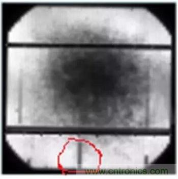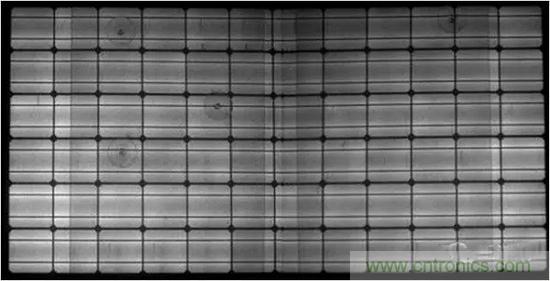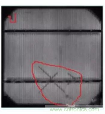 給晶硅組件施加電壓后,所激發(fā)出的電子和空穴復(fù)合的數(shù)量越多,其發(fā)射出的光子也就越多,所測(cè)得的EL圖像也就越亮;如果有的區(qū)域EL圖像比較暗,說明該處產(chǎn)生的電子和空穴數(shù)量較少(例如圖3中電池中部),代表該處存在缺陷(復(fù)合中心);如果有的區(qū)域完全是暗的,代表該處沒有發(fā)生電子和空穴的復(fù)合(圖3和圖4中紅線所標(biāo)處),也或者是所發(fā)光被其它障礙所遮擋(圖3和圖4主柵線處),無法檢測(cè)到信號(hào)。