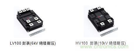 首次亮相展會的X系列雙管HVIGBT模塊,采用CSTBTTM 結(jié)構(gòu)的第7代IGBT和RFC二極管,降低功率損耗;運(yùn)用可降低內(nèi)部電感的封裝技術(shù),優(yōu)化產(chǎn)品性能;使用兩種封裝(LV100/HV100),實現(xiàn)兩種絕緣耐壓(6kV/10kV),但兩者具有相同的外形尺寸。LV100封裝包括900A/1.7kV和450A/3.3kV;HV100封裝包括450A/3.3kV、330A/4.5kV和225A/6.5kV;可提高系統(tǒng)結(jié)構(gòu)設(shè)計的靈活性,方便實現(xiàn)逆變器擴(kuò)容。