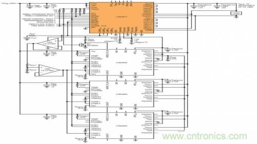 µModule DC/DC 穩(wěn)壓器可提供一種同時提供高功率輸出和 DPSM 功能的簡單和有效之方法。由于可容易地通過并聯(lián)多個 µModule 穩(wěn)壓器以提供高電流輸出 (各個通道彼此之間的電流匹配準確度標稱值在 1% 以內(nèi)),從而降低了產(chǎn)生熱點的可能性。而且,只有其中一個 µModule 穩(wěn)壓器必需具備 DPSM 能力,原因是即使并聯(lián)的 µModule 未內(nèi)置固有的 DPSM,它也能提供完整的數(shù)字接口。圖 2 示出了一個 LTM4677 (36A DPSM µModule) 與 3 個 LTM4650 (50A µModule) 相并聯(lián)的應用電路原理圖。