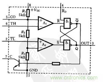 【導(dǎo)讀】首先介紹下555的內(nèi)部電路電路結(jié)構(gòu),如下,其中,三極管起控制作用,A1為反向比較器,A2為同向比較器,比較器的基準(zhǔn)電壓由電源電壓+Vcc及內(nèi)部電阻的分壓比決定。RS觸發(fā)器具有復(fù)位控制功能,可控制三極管的導(dǎo)通與截止。