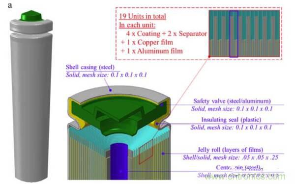 18650電池主要由三部分組成:安全閥、卷芯和低碳鋼外殼。安全閥通常由正溫度系數(shù)材料、鋁安全閥和不銹鋼正極端子、氣體密封墊等組成,電芯由正極、負極和隔膜組成,在本試驗中正極的活性物質(zhì)的成分為LiCoO2。軸向載荷的加載速度為5mm/min,所有的試驗電池在試驗之前都已經(jīng)完全放電(SOC=0)。測試結(jié)果顯示,18650電池在軸向壓力測試中壓力呈現(xiàn)出緩慢上升——快速上升——輕微下降——快速上升的趨勢,而電壓測試顯示,18650電池在變形達到4mm的情況下才會發(fā)生失效,而且通過試驗發(fā)現(xiàn),18650電池的電壓突降主要是由于電池內(nèi)部短路造成的,而不是內(nèi)部結(jié)構(gòu)的斷路。為了研究18650在軸向壓力下失效的機理,Juner Zhu還利用有限元軟件對其進行了分析,模型中的材料主要采用了彈塑性模型,并且考慮了各種材料的各向異性的特點,模型中包涵了上百萬的計算單元,軸向載荷的加載速度被設(shè)置為1m/s。