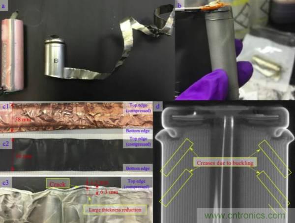 對試驗后的18650電池進行拆解顯示,雖然電芯發(fā)生了嚴重的變形,但是正負極并沒有發(fā)生斷裂,反而是隔膜在距離上部邊緣1.3mm的位置出現(xiàn)了一個裂縫,這直接導(dǎo)致了電池發(fā)生短路,電壓突降,而這一裂縫可能是由于金屬箔鋒利的邊緣侵入造成的。此外隔膜的在一些位置厚度出現(xiàn)了很大的下降,這主要是由于凹陷的外殼擠壓電芯造成的。