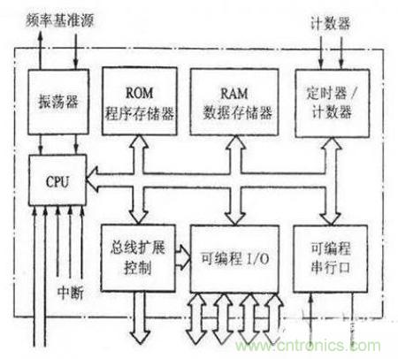 Ⅰ:中央處理器CPU,包括運(yùn)算器、控制器和寄存器組。是MCU內(nèi)部的核心部件,由運(yùn)算部件和控制部件兩大部分組成。前者能完成數(shù)據(jù)的算術(shù)邏輯運(yùn)算、位變量處理和數(shù)據(jù)傳送操作,后者是按一定時序協(xié)調(diào)工作,是分析和執(zhí)行指令的部件。