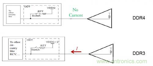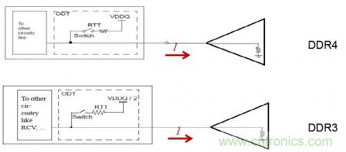 為了直觀的看出端接方式的差異對(duì)總的功耗的影響,下面分別比較了在輸出高和低得情況下,DDR4/DDR3的電流流向。