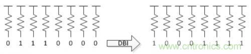 所以,一個(gè)降低DDR4系統(tǒng)功耗的方法是,盡量加大DDR4輸出高的數(shù)量。這個(gè)就是為什么DDR4中多了“DBI管腳”。舉個(gè)例子,當(dāng)8bit lane中有至少有5個(gè)DQ都是低時(shí),所有的Bit將會(huì)被翻轉(zhuǎn),并且DBI(Data Bus Inversion)置低,用來指示數(shù)據(jù)線的反轉(zhuǎn)。通過這個(gè)方法,總共9個(gè)信號(hào)中(8個(gè)DQ和1個(gè)DBI),總有至少5個(gè)是被驅(qū)動(dòng)為高電平。如果原始的數(shù)據(jù)中有4個(gè)或者更多的信號(hào)被驅(qū)動(dòng)為高時(shí),那么DBI信號(hào)也將會(huì)設(shè)為高,同樣,還是9個(gè)里面至少有5個(gè)為高。這樣的話,在每一個(gè)數(shù)據(jù)傳輸?shù)倪^程中,都是至少有5/9的數(shù)據(jù)是高電平,可以在一定程度上降低了功耗。