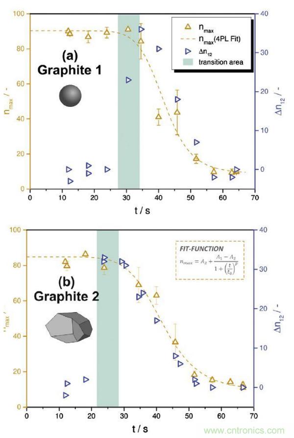 圖6.在烘干機(jī)中不同停留時(shí)間下第一張照片的nmax(三次實(shí)驗(yàn)平均值),以及第一、二張照片的差值Δn12(單次實(shí)驗(yàn))的對(duì)比:(a)Graphite 1 (球形, d50 = 8.9 μm) , (b) Graphite 2 (多面體, d50 = 20.4 μm)。nmax與四參數(shù)邏輯(4PL)擬合曲線(xiàn)近似,并表明了不同的初始平臺(tái)。從恒定nmax平臺(tái)到中間階段的過(guò)渡時(shí)域以綠色突出顯示。