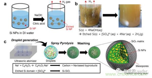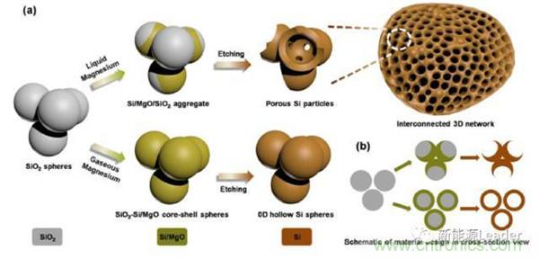 晶體Si的優(yōu)勢是容量高,首效高,缺點(diǎn)是體積膨脹大,為了克服這一問題,工業(yè)上一般是將晶體Si制成納米顆粒,分散在石墨之中,利用石墨吸收Si的體積膨脹。也可以將Si材料制成特殊形狀,例如Si納米線,蜂巢狀Si等。浙江大學(xué)的Hao Wu等「4」利用鎂熱反應(yīng)制成了蜂窩狀的硅材料,如下圖所示,獨(dú)特的蜂窩狀結(jié)構(gòu)能夠很好的吸收Si的體積膨脹,顯著改善了循環(huán)性能,循環(huán)800次容量仍然可達(dá)1058mAh/g,容量保持率為91%。