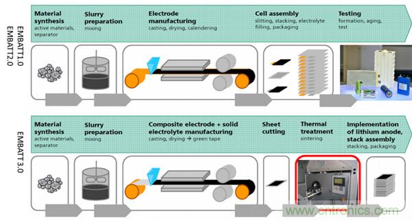 在制造工藝方面,1.0和2.0的制造工藝與現(xiàn)行的鋰離子電池制造工藝沒有明顯區(qū)別,在3.0上,由于采用全固態(tài)玻璃陶瓷電解液,因此電極和電解質的裝配可以在同一步驟完成,省卻了后面的注液環(huán)節(jié),但是后續(xù)增加了熱處理環(huán)節(jié),主要是為了讓電極和固態(tài)電解質界面更好的接觸。這3.0項目上,全固態(tài)電解質的開發(fā)、電解質與電極界面兼容性問題是重點研究內容,這與一般的固態(tài)電池的研究課題是一致的。