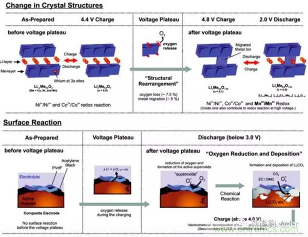 富鋰材料容量高,并且還具有低成本的優(yōu)勢,可以說是非常理想的鋰離子電池正極材料,當(dāng)然任何事情都不可能是完美的,在首次使用的過程中為了發(fā)揮出富鋰材料的高容量,要采用高電壓活化,這一過程中除了形成我們需要的Li2MnO3物相外,也會生成Li2O,還會釋放活性氧,這不僅會破壞富鋰材料自身的結(jié)構(gòu),還會導(dǎo)致電解液的氧化分解,造成較高的不可逆容量。此外富鋰材料在循環(huán)過程中還存在著層狀結(jié)構(gòu)向尖晶石結(jié)構(gòu)轉(zhuǎn)變的趨勢,這也導(dǎo)致富鋰材料的電壓平臺在循環(huán)過程中會持續(xù)的下降,容量不斷衰減,使得富鋰材料循環(huán)性能較差,反應(yīng)機理如下圖所示。