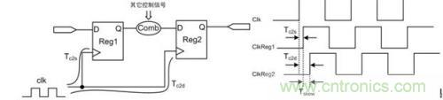 時序偏斜分析圖如圖 3所示。時鐘的分析起點是源寄存器(Reg1),終點是目標寄存器(Reg2)。時鐘在圖中的結(jié)構(gòu)中傳輸也會有延遲,時鐘信號從時鐘源傳輸?shù)皆醇拇嫫鞯难訒r為Tc2s,傳輸?shù)侥繕思拇嫫鞯难訒r為Tc2d。時鐘網(wǎng)絡的延時為Tc2s與Tc2d之差,即Tskew=Tc2d-Tc2s。