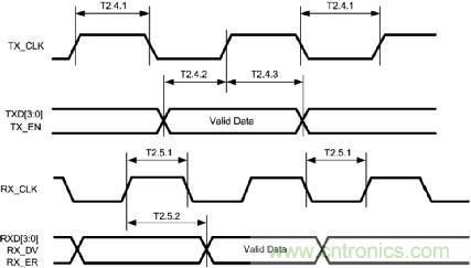 DT6000S項目上有4路光以太網(wǎng)接口連接到FPGA,由FPGA進行實現(xiàn)MAC層和解碼IEC61850的SV和GOOSE。以太網(wǎng)PHY通過MII接口和FPGA,因此FPGA與外部的接口有4路MII接口。項目初期是實現(xiàn)1路光以太網(wǎng)接口,并且驗證功能正確之后,但是后期變成的4路光以太網(wǎng)時,總會存在1路光以太網(wǎng)通信不正常。經(jīng)過分析得到是FPGA通MII接口和PHY的時序不滿足。如圖 9所示為MII接口的時序圖,時序不滿足分為TX_CLK和RX_CLK。