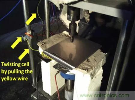 目前能夠模擬鋰離子電池內(nèi)短路的方式有多種,例如針刺測試,小壓痕測試,BAJ測試和機(jī)械擠壓測試等,通過對大尺寸方形電池特點的分析,Hsin Wang認(rèn)為機(jī)械擠壓測試最適合應(yīng)用方形鋰離子電池的測試上。但是在傳統(tǒng)的擠壓的測試中由于電池受到的破壞太大,幾乎所有的電池都會發(fā)生熱失控,因此傳統(tǒng)的擠壓測試對不同種類電池安全性的“分辨率”就很低,只有通過和不通過兩種結(jié)果,只能對鋰離子電池的安全性進(jìn)行定性分析??赡軆蓚€電池都沒有通過安全性測試,但是A電池的安全性卻要好于B電池,為了能夠準(zhǔn)確的評估不同體系電池的安全性能,Hsin Wang對傳統(tǒng)的擠壓實驗進(jìn)行了改進(jìn),通過在電池負(fù)極極耳上施加一個拉力,讓電池產(chǎn)生大約5°的扭曲,從而減少在擠壓過程中電池受到的破壞,因此該實驗?zāi)軌驕?zhǔn)確的評估不同種類電池的的安全性高低。