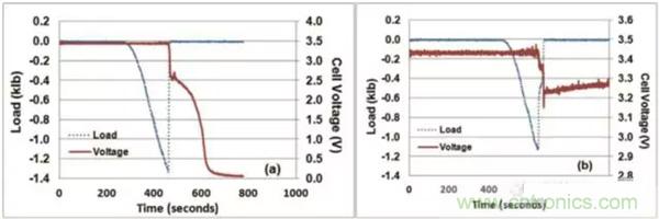 為了方便讀者理解本文,下圖是給出了LFP電池一個非常典型的成功通過機(jī)械擠壓測試(正反饋)的判據(jù),電池擠壓變形達(dá)到一定的程度后,引起了電池內(nèi)短路的發(fā)生,電池電壓迅速下降,檢測到電壓下降后(0.1V),擠壓力隨之被移除,電池的電壓快速回升,電池沒有發(fā)生熱失控,則電池通過擠壓實驗。