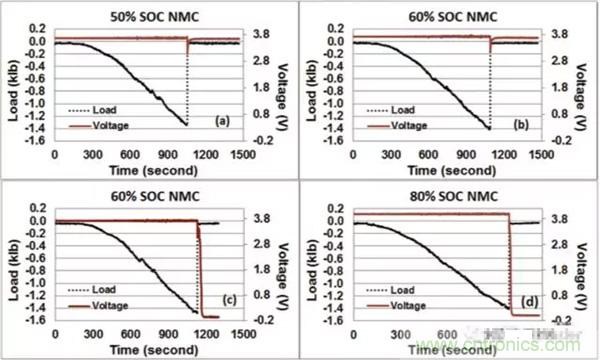 在對25Ah的NMC電池擠壓-扭轉(zhuǎn)測試中,發(fā)現(xiàn)50%SoC狀態(tài)下的電池都成功通過了測試,如圖a所示,60%SoC狀態(tài)下的電池有三只通過了測試,如圖b所示,另外的三只沒有通過測試,如圖c所示,可見60%SoC的電池通過測試和不通過測試的概率各為50%,而80%SoC的電池則都沒有通過測試,如圖d所示。由此可見,60%SoC是NMC電池安全性的一個分水嶺,低于這個數(shù)值時電池相對是安全的,高于這個數(shù)值,則電池在機(jī)械濫用的情況下的安全性將大大下降。