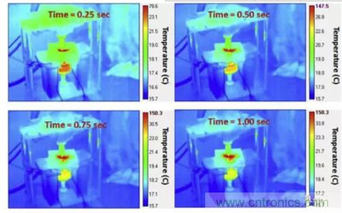 下圖為60%SoC的NMC電池在擠壓-扭轉(zhuǎn)實驗中的熱成像圖,從圖中可以看到在短路發(fā)生后,短路點的溫度在0.5S內(nèi)迅速升高到了147.5 ℃,隨后高溫區(qū)域迅速向周圍擴(kuò)展,說明周圍區(qū)域溫度升高并不是由熱傳導(dǎo)導(dǎo)致的,而是高溫引發(fā)了其他的化學(xué)反應(yīng)。而在80%SoC下,NMC電池發(fā)生熱失控的溫度更高,引起周圍化學(xué)反應(yīng)的速度也更快。