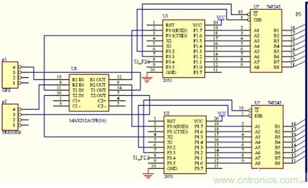 經(jīng)過分析,我們分別使用一塊2051單片機(jī)接收各路串口傳感器的數(shù)據(jù),同時(shí)使用一塊多路高精度ADC對轉(zhuǎn)換成電壓的溫度等信號(hào)采樣,系統(tǒng)結(jié)構(gòu)圖如圖1所示。主從機(jī)之間的具體管腳連接參見圖2。