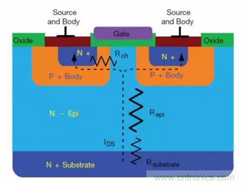 圖1顯示了一種傳統(tǒng)平面式高壓MOSFET的簡單結(jié)構(gòu)。平面式MOSFET通常具有高單位芯片面積漏源導(dǎo)通電阻,并伴隨相對更高的漏源電阻。使用高單元密度和大管芯尺寸可實現(xiàn)較低的RDS(on)值。但大單元密度和管芯尺寸還伴隨高柵極和輸出電荷,這會增加開關(guān)損耗和成本。另外還存在對于總硅片電阻能夠達到多低的限制。器件的總RDS(on)可表示為通道、epi和襯底三個分量之和: