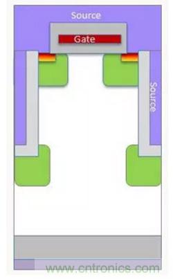 圖2顯示平面式MOSFET情況下構(gòu)成RDS(on) 的各個分量。對于低壓MOSFET,三個分量是相似的。但隨著額定電壓增加,外延層需要更厚和更輕摻雜,以阻斷高壓。額定電壓每增加一倍,維持相同的RDS(on)所需的面積就增加為原來的五倍以上。對于額定電壓為600V的MOSFET,超過95%的電阻來自外延層。顯然,要想顯著減小RDS(on)的值,就需要找到一種對漂移區(qū)進行重摻雜的方法,并大幅減小epi電阻。