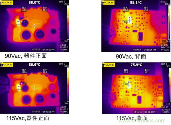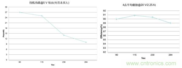 我們?cè)?0 Vac、115 Vac、230 Vac、264 Vac 條件下,測(cè)得該方案于5 V輸出(電纜未插入)的待機(jī)功耗都低于27 mW,在評(píng)估板端測(cè)得在115 Vac和230 Vac的條件下,20 V/2.25 A輸出的平均能效超過(guò)90%。
