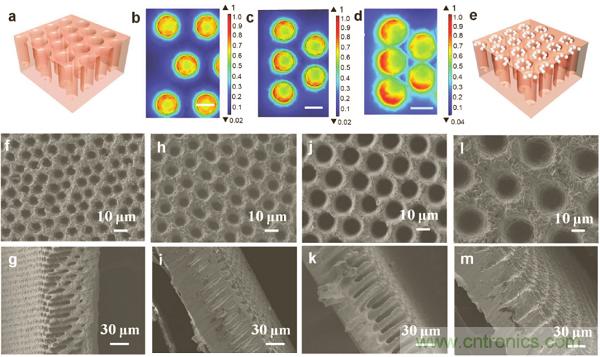 b-d)多孔銅集流體上表面的電流密度分布模擬結(jié)果,圖中標(biāo)尺為10 μm。
