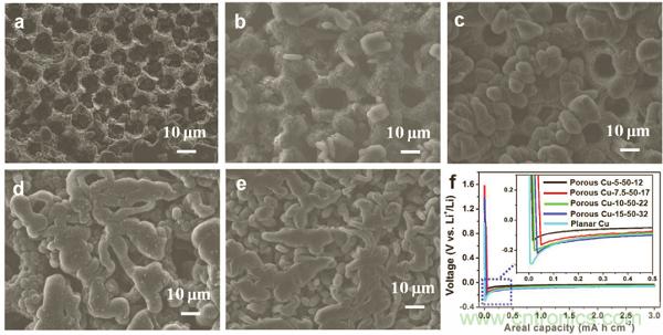 f)Li沉積在不同孔尺寸集流體內(nèi)的過電勢比較