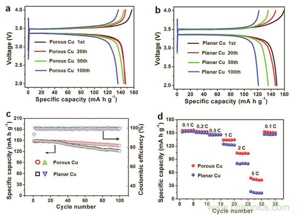 c)平板銅和多孔銅為集流體時,Li / LFP電池的循環(huán)性能比較