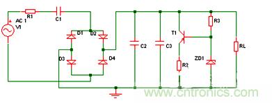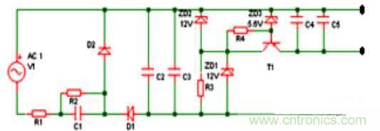 D1作半波整流用,C2、C3為濾波電容,交流電源U上半周時(shí),經(jīng)C1、R1降壓,由D1整流后給電容C2平滑濾波輸出
