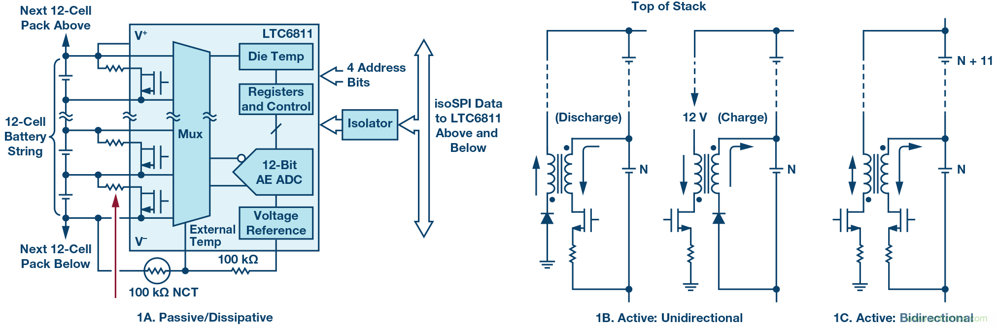如圖1a所示,被動均衡既簡單又便宜。然而,被動均衡也非常緩慢,會在電池包內(nèi)部產(chǎn)生有害的熱量,均衡結(jié)果是將所有電池單元的剩余容量減少到與電池包中SoC最低的電池單元一致。此外,被動均衡缺乏能力有效解決另一種常見現(xiàn)象——容量不匹配引起的SoC誤差。所有電池單元在老化時都會損失容量,損失速率往往不同,原因類似于串聯(lián)電池單元的充電狀態(tài)隨著時間推移而出現(xiàn)差異。電池包電流均等地流入和流出所有串聯(lián)電池單元,因此電池包的可用容量取決于電池包中容量最低的電池單元。只有圖1b和圖1c所示的主動均衡方法可以讓電荷在整個電池包中重新分配,補償電池單元間不匹配所造成的容量損失。