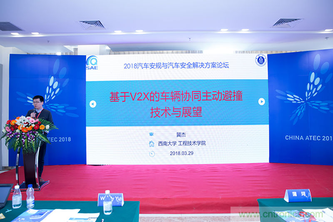 西南大學(xué)汽車(chē)電子專(zhuān)家冀杰博士在論壇上做了車(chē)規(guī)與基于V2X的車(chē)輛協(xié)同主動(dòng)避撞技術(shù)展望的大會(huì)報(bào)告。