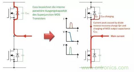 在導(dǎo)通期間,該電壓依賴性導(dǎo)致?lián)p耗誘導(dǎo)的充電電流的主要部分流過(guò)Q1的低VDS。然而,Q1兩端的低電壓意味著半橋?qū)ǖ牡投司w管有著高電壓導(dǎo)通。由于充電電流峰值,導(dǎo)致晶體管的導(dǎo)通損耗很高。