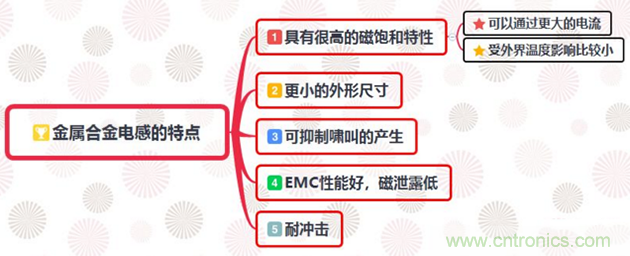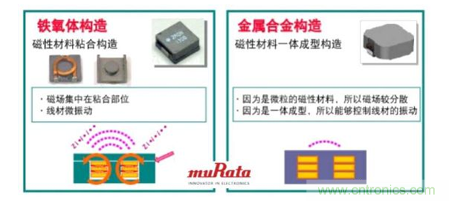 以村田公司生產(chǎn)的功率電感器為例,從產(chǎn)品工藝上可分為繞線電感和疊層電感,從材料上可分為金屬合金粉(一體成型)電感和鐵氧體電感。與鐵氧體電感相比,金屬合金電感有以下特點(diǎn):