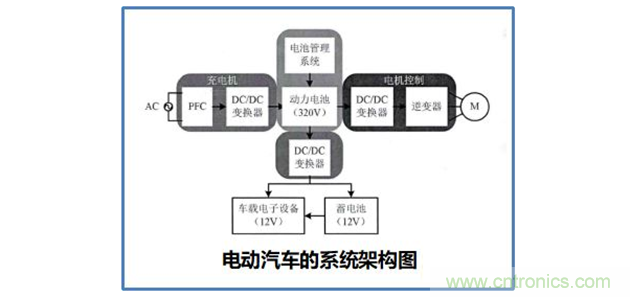 另一方面,DC/DC變換器可以將電動(dòng)機(jī)制動(dòng)剎車(chē)時(shí)由機(jī)械能轉(zhuǎn)化而來(lái)的電能回饋給蓄電池組,其效率高達(dá)85%~95%,遠(yuǎn)大于發(fā)電機(jī)的正常效率。以可控的方式給蓄電池組充電,尤其是在電動(dòng)汽車(chē)需要頻繁啟動(dòng)和制動(dòng)的城市工況運(yùn)行條件下,可以有效地回收制動(dòng)能量,增加電動(dòng)汽車(chē)的行駛里程。因此,電動(dòng)汽車(chē)采用DC/DC變換器可以?xún)?yōu)化電動(dòng)機(jī)控制、提高電動(dòng)汽車(chē)的整體效率和性能。下圖為電動(dòng)汽車(chē)的系統(tǒng)架構(gòu)圖。