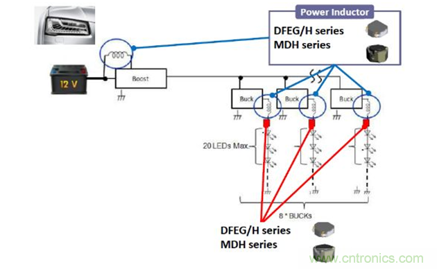 在汽車(chē)應(yīng)用中,目前車(chē)燈廣泛采用LED光源,因此會(huì)用到Boost DC/DC和Buck DC/DC等轉(zhuǎn)換器。