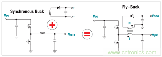 圖1:Fly-Buck轉(zhuǎn)換器創(chuàng)建方式是在一個同步降壓轉(zhuǎn)換器內(nèi)添加耦合繞組。