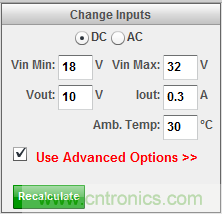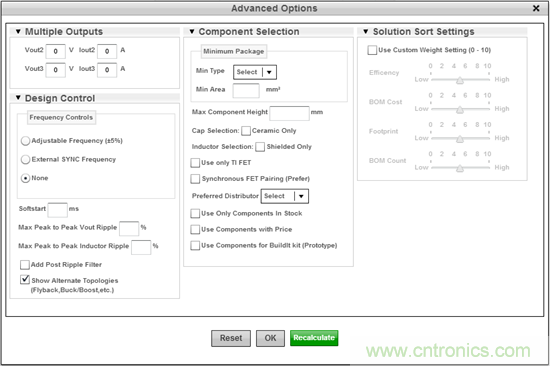 單擊“Use Advanced Options”(使用高級選項)來打開Advanced Options菜單(圖3)。在Design Control(設(shè)計控制)項下,確保“Show Alternate Topologies”(顯示替代拓撲)復(fù)選框被選中,這樣將列出所有可能的Fly-Buck解決方案。在你確認復(fù)選框的選擇后,單擊“Recalculate”(重新計算)按鈕來繼續(xù)。