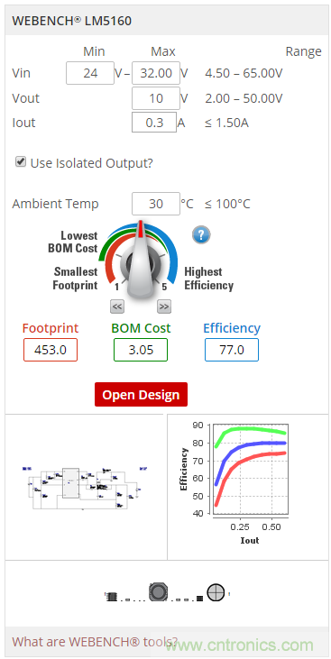 在第二個方法中,你需要確定打算在Fly-Buck設(shè)計中使用的器件。比如說,你打算在Fly-Buck設(shè)計中使用LM5160。在LM5160產(chǎn)品文件夾中,你將會找到一個專門為這個器件創(chuàng)建的WEBENCH設(shè)計工具控制面板(圖4)。