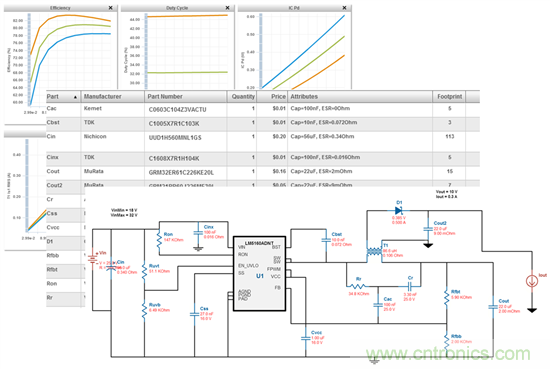 圖5:WEBENCH工具提供針對你Fly-Buck設(shè)計的一個功率耗散值列表,一個完整的BOM和一個電路原理圖。