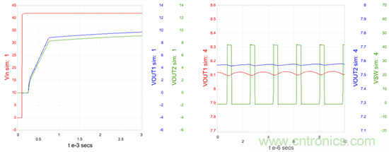 圖6:在WEBENCH電源設(shè)計工具中針對一個Fly-Buck設(shè)計生成的啟動和穩(wěn)定狀態(tài)波形