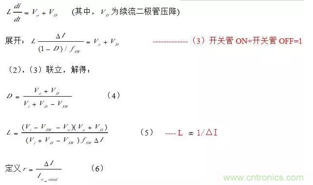 此值一般為常量。從(5)式可以得到:電感值越大,I?就越小,因此r就越小。但這往往導(dǎo)致需要一個很大的電感才能辦到,所以絕大部分的Buck型開關(guān)電源選擇r值在0.25~0.5之間。