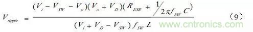 對像手機(jī)、PMP、數(shù)據(jù)卡這類的消費類電子用到的低功率開關(guān)電源,V(sw)和V(D)都在0.1V~0.3V之間,因此可對公式(7)、(12)進(jìn)行簡化,得到: