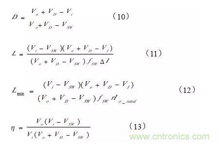 下面以Buck型開關(guān)電源為例推導(dǎo)占空比、電感值和效率公式。