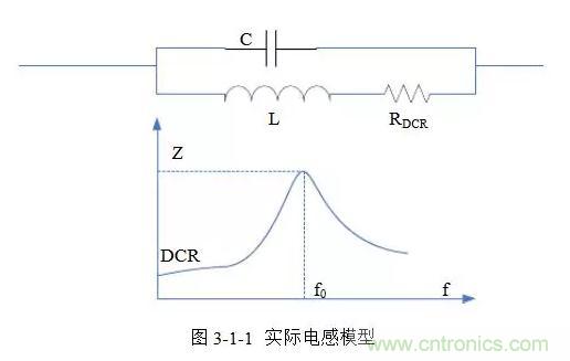 理想模式的電感,其阻抗與頻率呈線性關(guān)系,會隨頻率升高而增大。實際電感模型如圖3-1-1所示,由電感L串聯(lián)R(DCR)和寄生電容C并聯(lián)而成,存在自激頻率f(o)。頻率小于f(o)時呈感性,大于f(o)時呈容性,在f(o)處阻抗最大。
