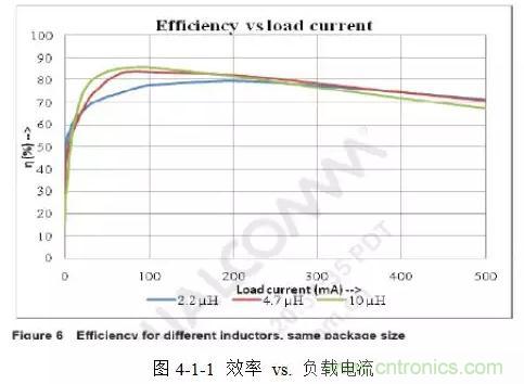 而大容量的電感具有較低的紋波電流和紋波電壓,較低的AC和傳導(dǎo)損失,在輕載時有較高的效率。圖4-1-1所示是Taiyo Yuden三種 2518封裝不同容量大小的電感負(fù)載電流跟效率的關(guān)系曲線。