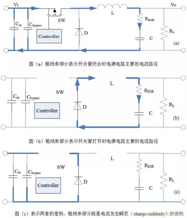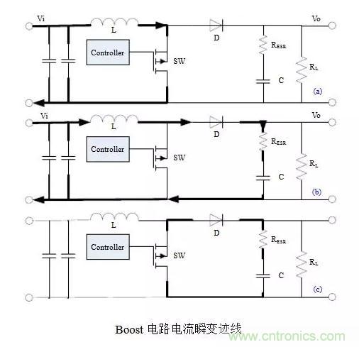 以Buck電路為例,不管開關(guān)管是由閉合-打開還是打開-閉合,電流發(fā)生瞬變的部分都如圖(c)所示,它們是會產(chǎn)生非常豐富的諧波分量的上升沿或下降沿。通俗的講,這些會產(chǎn)生瞬變的電流跡線(trace)就是所謂的“交流”(AC current),其余部分是“直流”(DC current)。當(dāng)然這里交直流的區(qū)別不是傳統(tǒng)教科書上的定義,而是指開關(guān)管的PWM頻率只是“交流”FFT變換里的一個分量,而在“直流”里這樣的諧波分量很低,可忽略不記。所以儲能電感屬于“直流”也就不奇怪,畢竟電感具有阻止電流發(fā)生瞬變的特性。因此,在開關(guān)電源布局時,“交流”跡線是最重要和最需要仔細(xì)考慮的地方。這也是需要牢記的唯一基本定律(only basic rule),并適用于其它法則和拓?fù)洹O聢D表示了Boost電路電流瞬變跡線,注意它和Buck電路的區(qū)別。