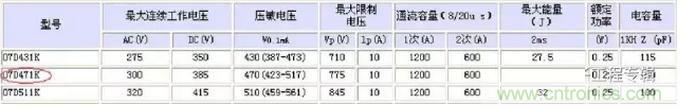 結(jié)合前面所述,來看一下本電路中壓敏電阻的型號所對應(yīng)的相關(guān)參數(shù)。